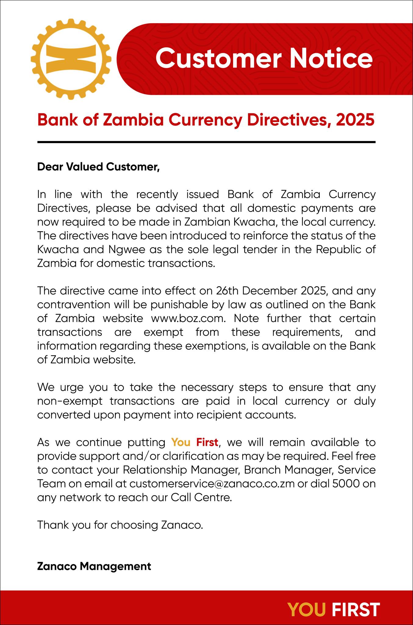 Customer Notice – Bank of Zambia Currency Directives, 2025